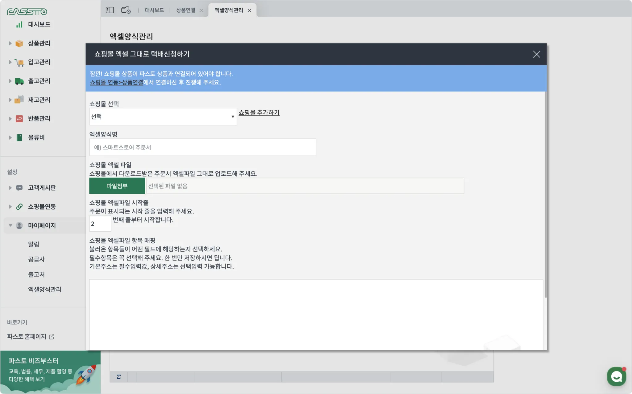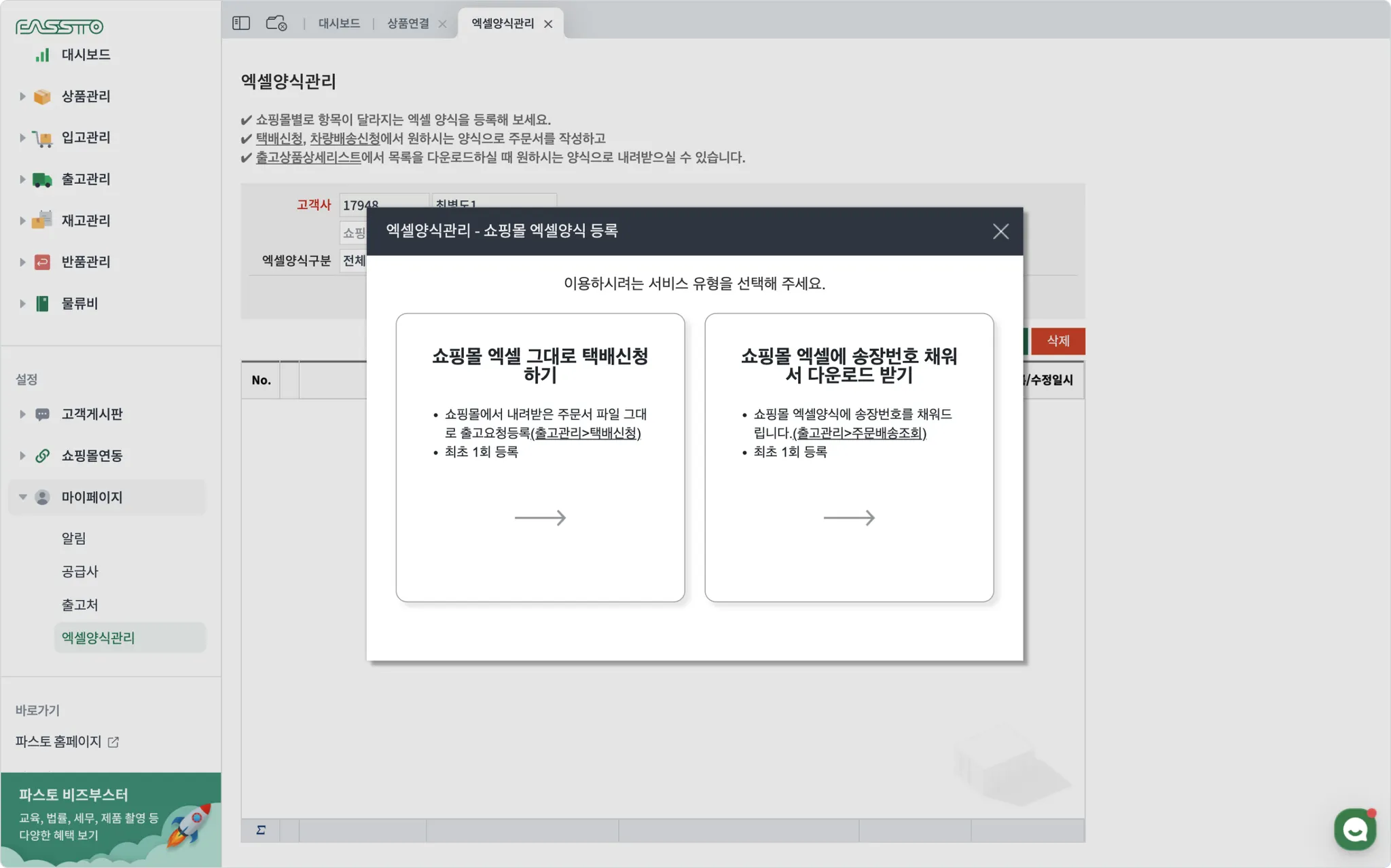 1) [FMS > 마이페이지 > 엑셀양식관리 > 쇼핑몰 엑셀양식 등록]에서 [쇼핑몰 엑셀 그대로 택배신청하기]를 선택해주세요.