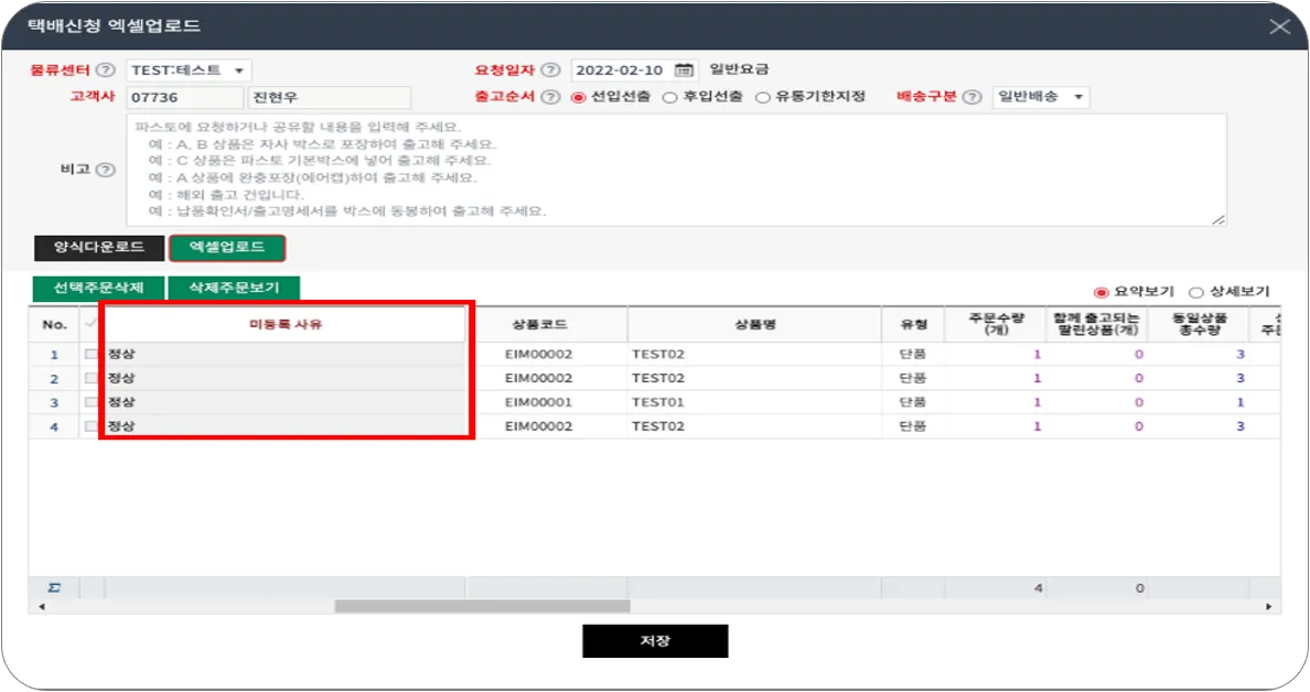 2) 쇼핑몰 주문서 엑셀을 업로드하시면, FMS가 주문서를 인식해 입력합니다. 정상적으로 입력이 된 경우에는 미등록사유에 “정상”으로 표기됩니다. 상품이 연결되지 않거나, 재고가 부족한 경우 미등록 사유에 케이스별로 표기되오니 미등록사유를 꼭 확인해주세요.