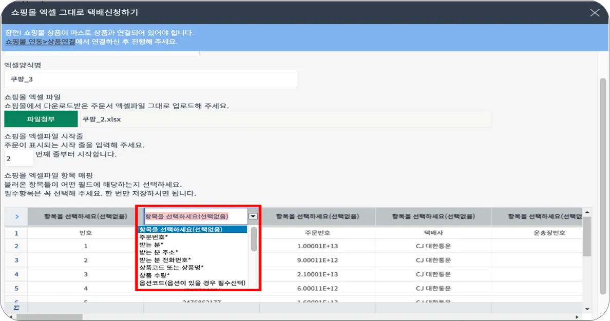 3) 쇼핑몰 주문서에서 FMS 출고신청에 꼭 필요한 필수항목을 맵핑해주세요.