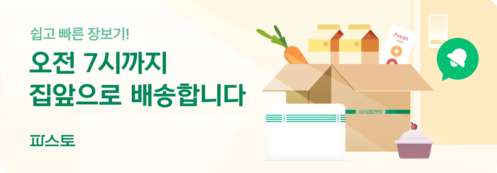 대형마트에 입점하지 않아도 새벽배송이 가능한 파스토 새벽배송 서비스를 이용하고 계시다면, 아래 배너를 자사 쇼핑몰에 활용해보세요.