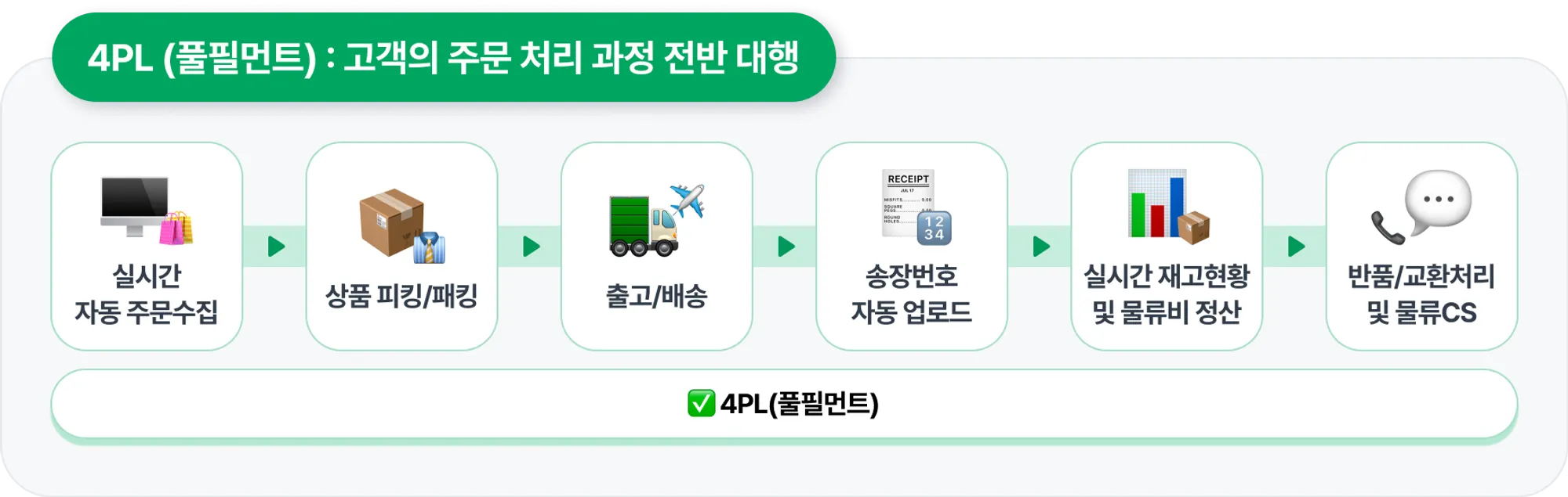 3PL은 ‘소품종 다량 화물 중심’의 사업에 적합한 서비스라면, 4PL(풀필먼트)는 ‘다품종 소량 상품 중심’의 이커머스 시장의 변화에 발맞춰 다양한 업종, 수량의 제품을 판매하는 판매자에게 맞춤형 물류 서비스를 제공해 준다는 것에 차이가 있습니다.