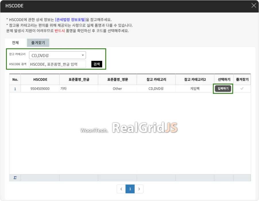 검색결과에서 입력할 코드의 입력하기 버튼을 클릭합니다.