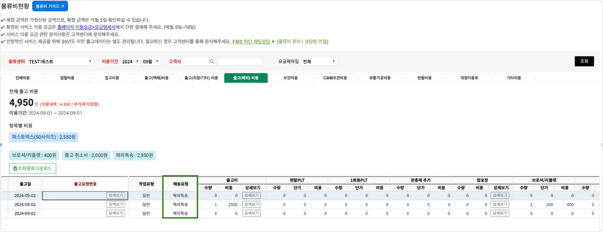 FMS 물류비현황에서 출고(해외) 비용 탭이 추가되었습니다.