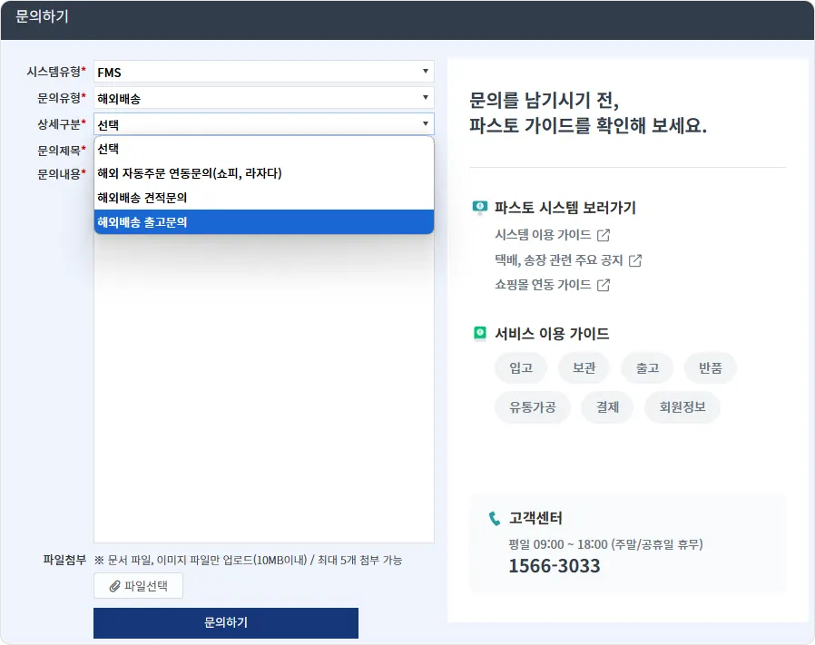 해외 자동출고 서비스는 사전에 파스토 고객센터 및 FMS 1:1 게시판을 통해 이용 의사를 접수해주세요!