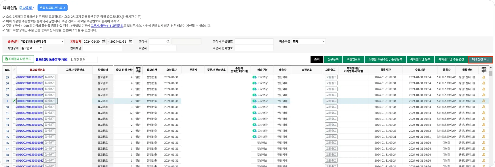 주문번호 기준으로 택배신청 화면에서 조회 및 접수가 가능합니다.