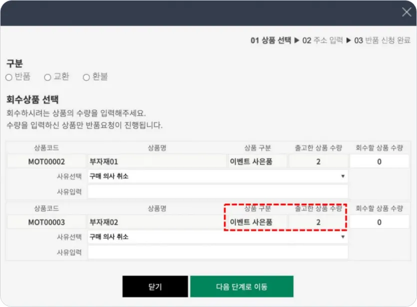 이벤트 사은품이 포함된 주문번호 반품은 아래 경로로 진행이 가능합니다.