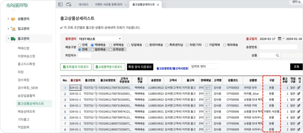 이벤트 사은품 출고 현황은 FMS 출고관리 內 택배신청, 출고상품상세리스트를 통해 확인하실 수 있습니다.